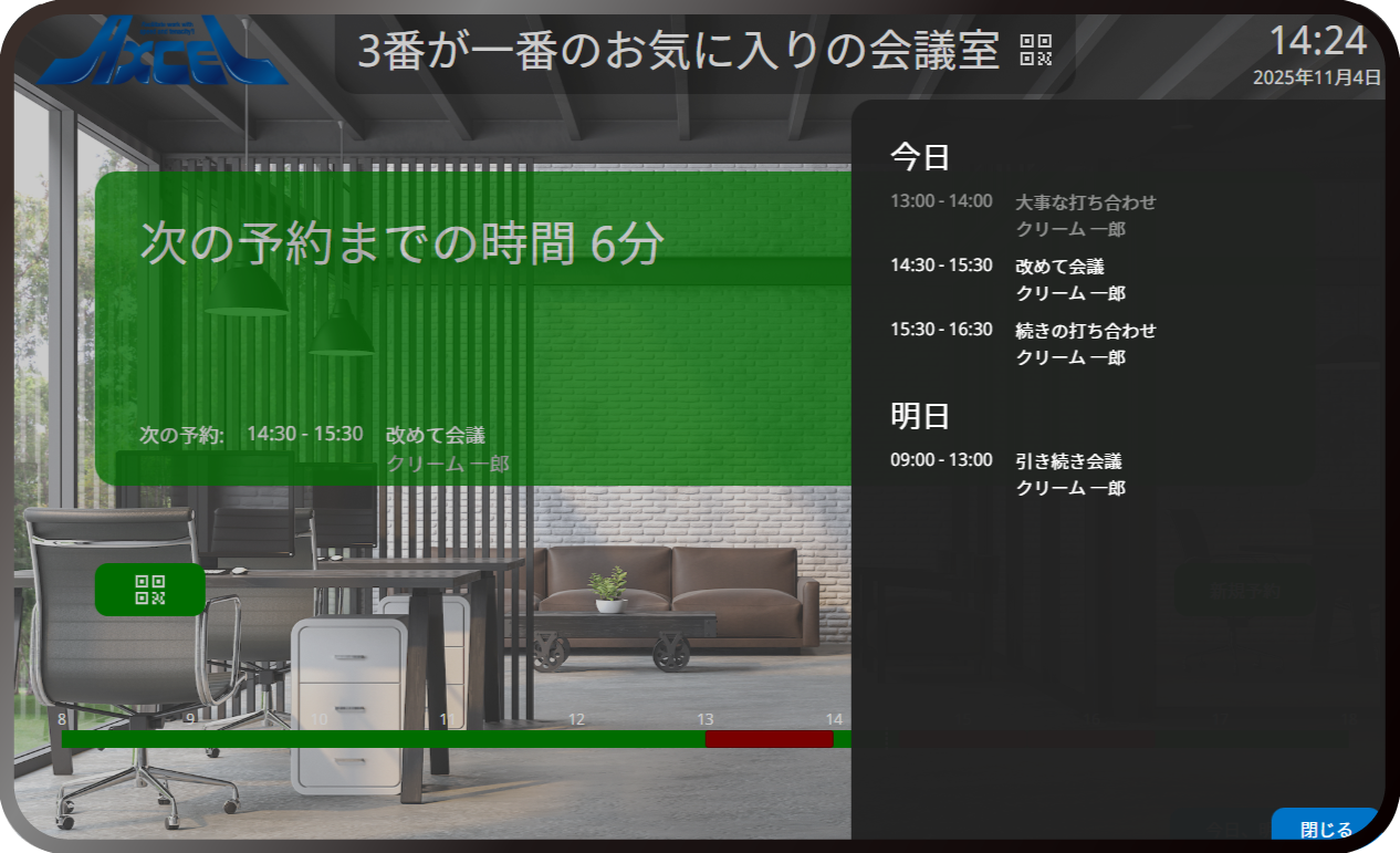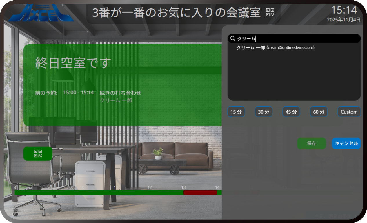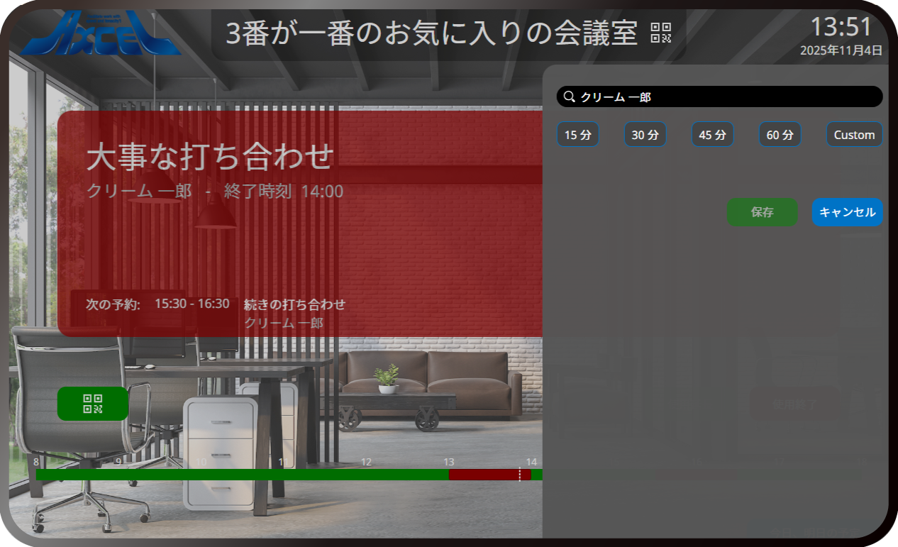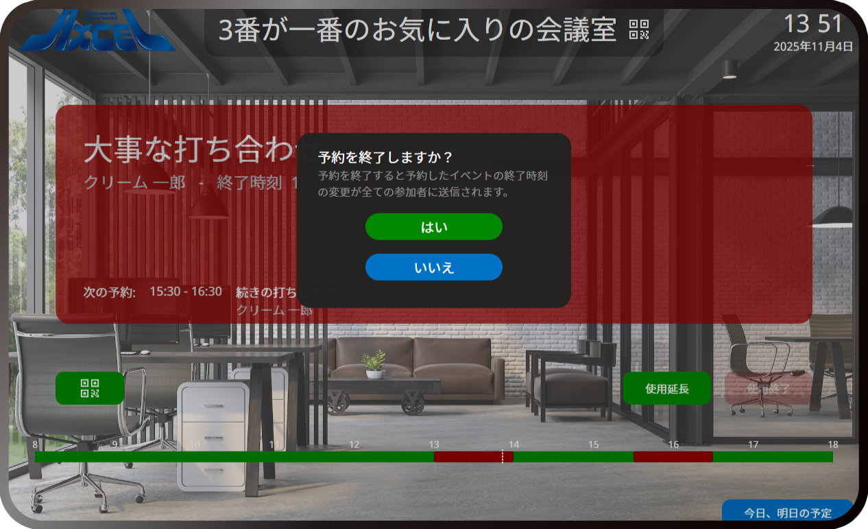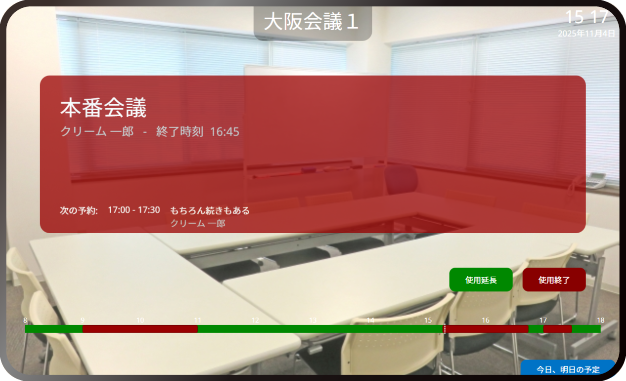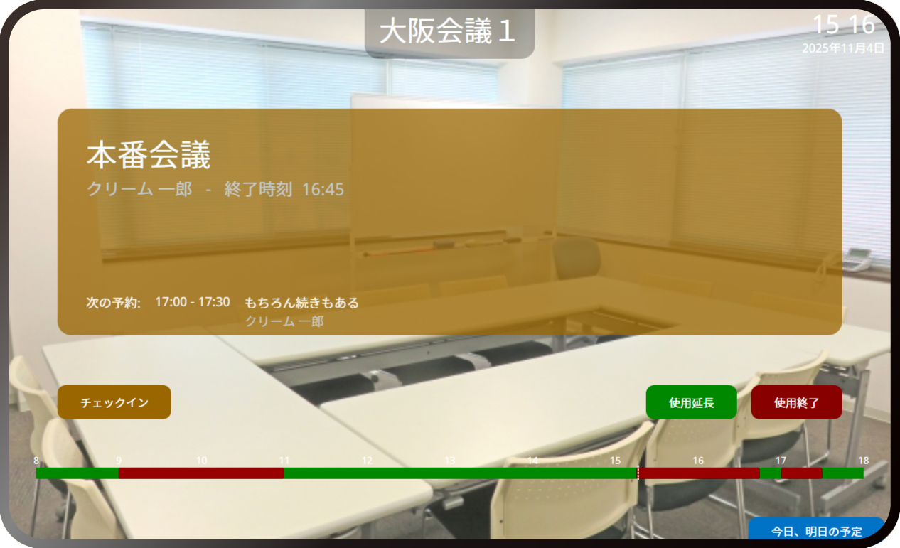OnTime Rooms 会議室をより効率的に使う HOME OnTime Rooms 会議室ソリューション 日本の組織がスケジュール管理で連携したい第一候補、 それが会議室予約管理、そして会議室前ドアサイン、 OnTime Rooms。OnTimeからいよいよ登場です。 OnTime Rooms の特徴的な機能 会議室ドア、会議室フロアに必要とされる機能を集約。 会議室ドア表示 一覧表示(会議室別) 一覧表示(予約一覧) 自組織の独自のデザイン、様々なオプションなど多数のカスタマイズ機能。 端末は日本語、英語、ドイツ語、デンマーク語の4カ国語対応。管理画面は日本語と英語の両対応。 同期連携する会議室数だけのライセンス形態(5会議室から提供しランクアップでディスカウント)。 ドアサイン、フロア情報など端末台数は無制限。 OnTime for Microsoft、OnTime for Dominoのどちらとも共通API経由で動作します。 (OnTime OpenAPIは必要としません。OnTime Group Calendar コアライセンスは必要) OnTimeはご要望に応じて随時新機能の追加を行っています。ご要望を是非お寄せください。 (受付管理は来訪者管理オプション、ケータリングはケータリングオプションをご利用ください。) 会議室前ルームサイン ※クリックで拡大画像をご覧いただけます。 会議室前ドアサイン 会議室前に配備するドアサインもデジタル化。単なる利用中/未利用の表示だけでなく、即時終了、新規予約などの機能も設定可能。 チェックイン機能 日本市場でご要望の多いチェックイン機能を実装しました。指定時間内にチェックイン処理が行われない場合は、キャンセルされ会議室は開放されます。さらに会議招待で複数の会議室を予約している場合でもチェックインがされなかった会議室だけ開放が行われます。 使用延長機能 後続の会議予約が無い場合は次の予約までの時間を延長できます。 使用終了機能 「はい」を押すことで今の時間で会議を終了してスケジュールデータとして反映されます。 反映されると空き会議室としてご利用いただけるようになります。 会議室前からも即時に新規予約 空いている会議室の予約が入っていなければ、その場で予約をして利用開始。 今後の予定の確認 今日の予定は画面下部にタイムスケールとともに表示。今日明日の予定を一覧で確認することも出来ます。 Mobileクライアント連携 QRコードを表示してMobileクライアントへ 端末画面にOnTime Mobileと連携できるQRコード機能を追加しました。OnTime Mobileクライアントでスキャンするだけで、そのルームの管理画面に直接アクセスして、新規予約、予約延長、即時解放などを行うことができます。 OnTime MobileのRooms機能 最新のOnTime Mobileクライアントは、OnTime Roomsとシームレスに連携し、空室状況と使用状況がより一覧でわかるようになりました。下部のナビゲーションメニューに「Rooms」を表示されます。 OnTime Mobileクライアントオプションが必要です。 一覧サイネージ 一覧表示(会議室別) 会議室フロアで自分の会議がどこで行われているか迷うことはもうありません。各会議室の状況を一覧で把握することができます。 一覧表示(予約一覧) 会議室フロアで自分の会議がどこで行われているか迷うことはもうありません。今行われている会議を随時更新しながら表示します。 OnTime Rooms 管理センター ダッシュボード OnTime for Microsoftの管理センターと共通のデザイン。トップページのダッシュボードでは端末利用状況、ログ、利用状況のCSV出力も行えます。 背景やロゴ画像の管理 自組織のロゴや背景画像の管理、それを元に各種デザインした表示端末設定で自社独自のイメージでご利用ください。 https://ontimesuite.jp/wp-content/uploads/2023/12/customize-lifted.mp4 表示端末設定(テンプレート) 応接フロア、来客フロア、役員フロア、商談フロア。各フロアに最適なデザインを表示端末設定としてテンプレート管理。この機能でフロア毎のデザインの一括更新も瞬時に可能です。 ※画面は開発中の画面も含みます。製品では予告なく変更される場合もございます。 ※本文中の会社名・製品名は、一般に各社の商標または登録商標です。 なお記載されている会社名・製品名などには、必ずしも商標表示®をつけておりません。