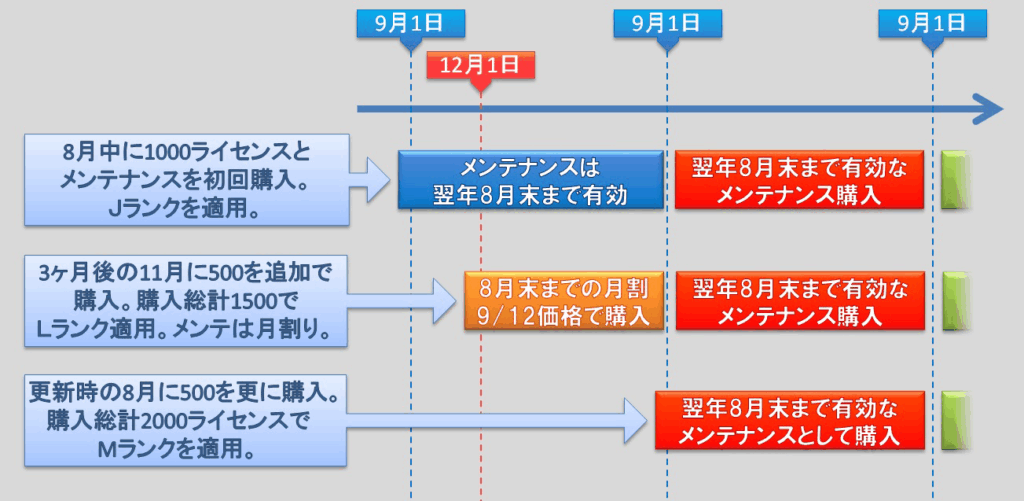 ソフトウェアメンテナンスは毎年アニバーサリーデートに更新となります。追加購入がアニバーサリーデートの前月でない場合は月割り計算を行い次回のアニバーサリーデートでの更新をシンプルにします。また月中のいつご購入いただいてもソフトウェアメンテナンスは翌月からの課金となり、追加購入分のソフトウェアメンテナンスは月末まで無償期間となります。新しいアクティベーションキーをシステムに登録いただくとキーをお受け取りになられた日からすぐにご利用いただけます。(各月の1日から確実にご利用になられたい場合は前月中に必ずご発注及び納品をご計画お願いいたします。)